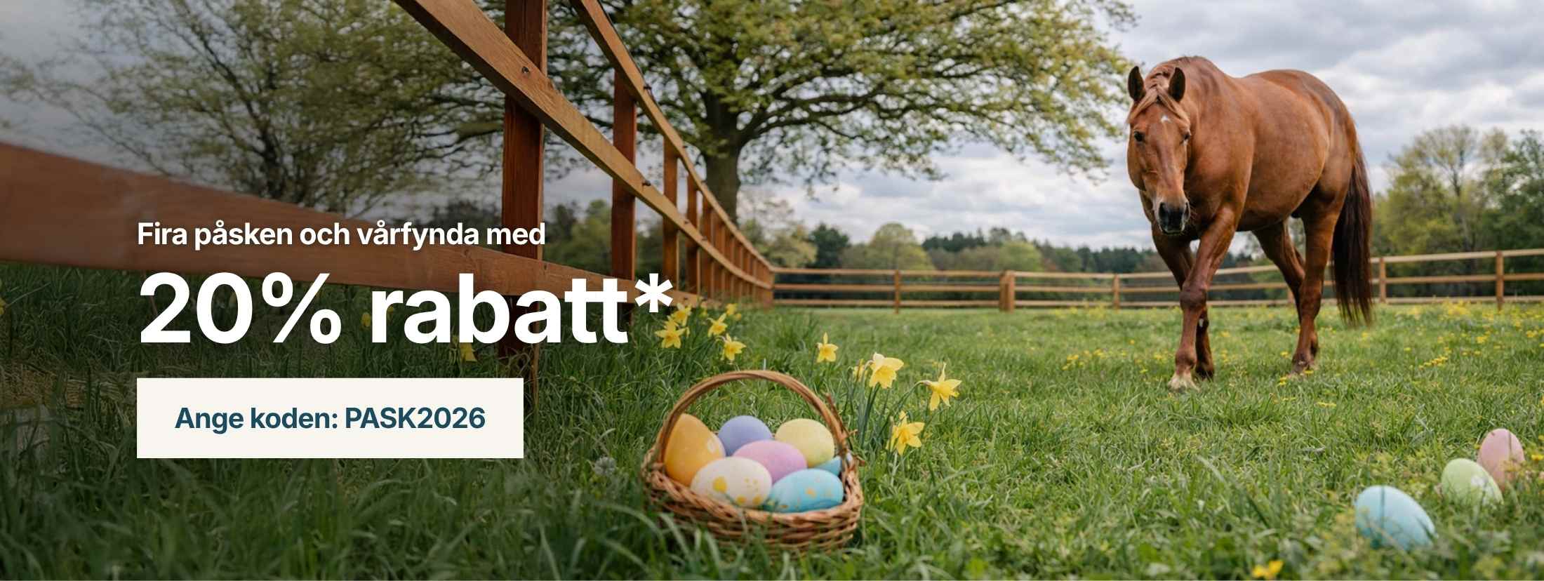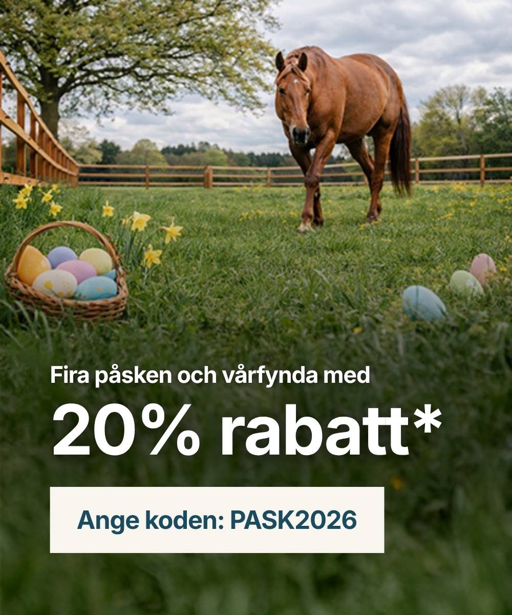*Giltig till 06-04-2026. Kan inte kombineras med andra rabattkoder, rabatterade produkter och gäller inte fraktkostnader. Följande varumärken är exkluderade: Kentucky Horsewear, Grooming Deluxe by Kentucky, Kingsland, K9, Uvex, Boss Equestrian, Samshield, Racesafe, Dyon, NAF, Birth Alarm, Freejump, Beris, Bombers, Ariat, by Equality line, Charles Owen, Fleck, Kevin Bacon, Prestige, Roeckl, Tech Stirrups, Veredus, Horseware, Schockemöhle Sports, Aesculap, HKM, William Leistner, EGO7.