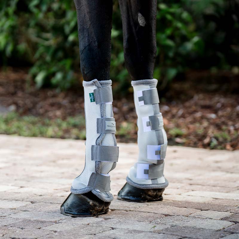 Horsewares grå Fly Boots är lätta och ventilerande flugbenskydd som hjälper till att skydda hästens ben mot flugor, bitande insekter och UV-strålning. De är tillverkade i ett 3D-konstruerat polyestermesh som ger god luftcirkulation och en sval känsla runt benen.