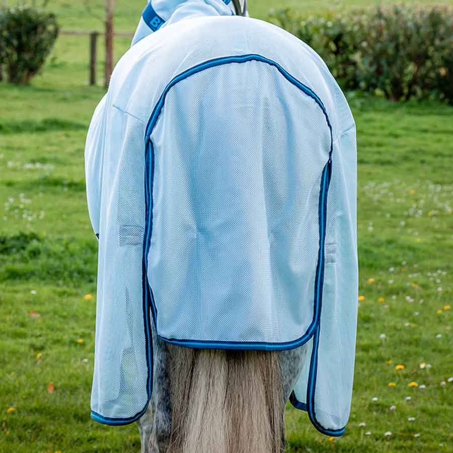 Horsewares Bug Buster, här i ljusblått, är ett högkvalitativt flugtäcke som erbjuder ett effektivt skydd mot såväl solens starka UV-strålar som flugor och andra irriterande insekter. Det välventilerade materialet säkerställer att hästen håller sig sval och torr, samtidigt som de utskurna benvalven och noggrant framtagna passformen säkerställer maximal rörelsefrihet och optimal komfort.