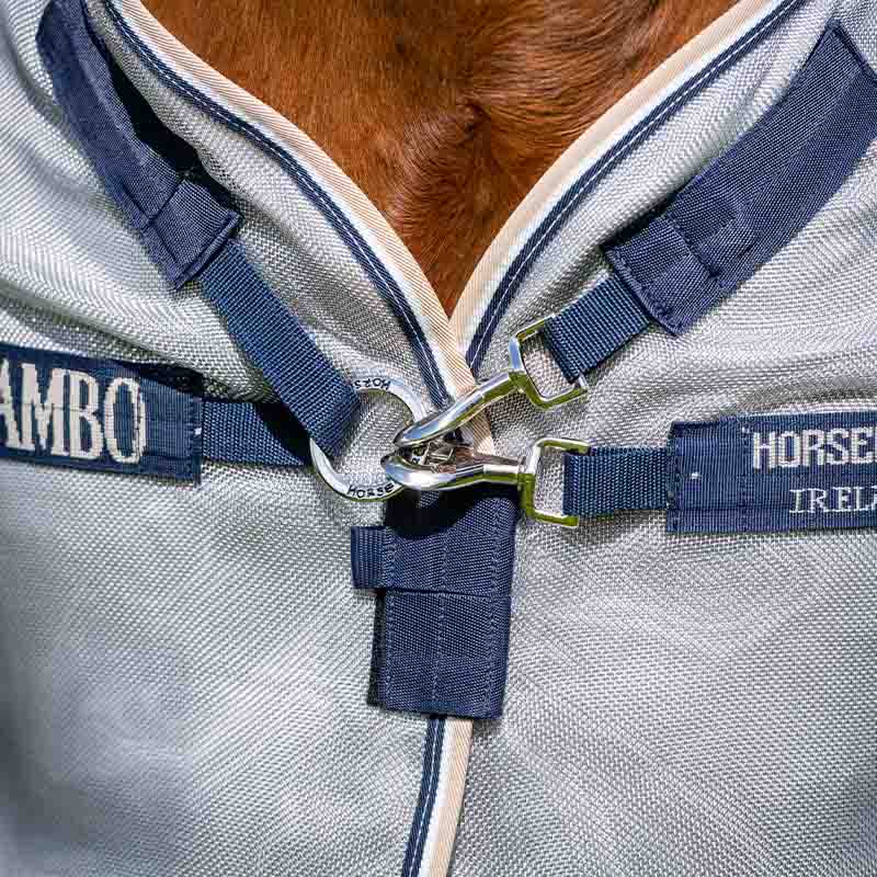 För att förhindra skav är insidan klädd med glansigt tyg vid bog och manke, något som är effektivt även på de mest aktiva hästarna. Insektstäcket är utrustat med Horsewares V-knäppe i fronten som säkerställer en perfekt passform och stark förslutning, vilket förstärks ytterligare av de tre maggjordarna. Rambo Protctor är dessutom utformat för att gå längre ned på sidorna och på så sätt täcka magen på hästen när man knäpper gjordarna. Stor och bred flärp över svansen som håller irriterande insekter borta från svansroten.