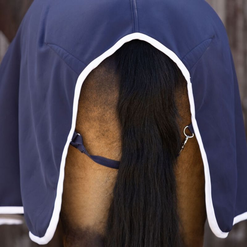 Eskadrons coolertäcke Jersey Show i marinblått är både robust och lättskött, vilket gör det till ett praktiskt val för din häst. Täcket har en fleeceinsida som ger extra komfort och hög andbarhet, vilket hjälper till att hålla hästen torr och bekväm. Det är utrustat med en justerbar gjord och svansrem för en säker passform. Täcket har även ett kontrastfärgat kantband och en broderad logga vid halsen, samt en brodyrplatta framtill för en stilren look.