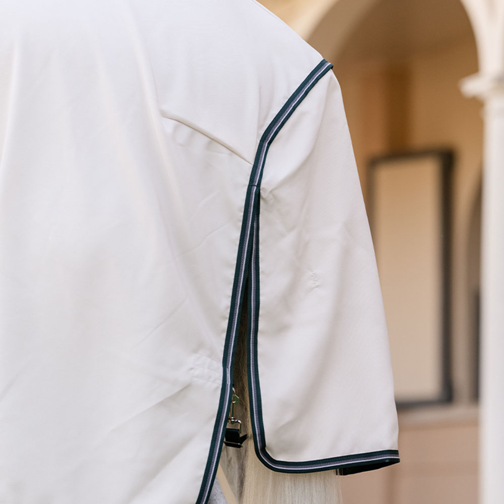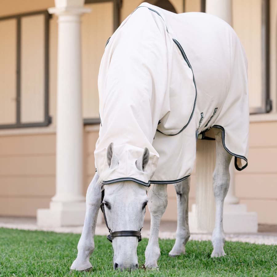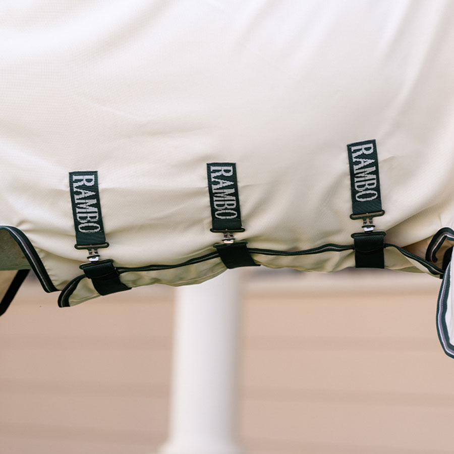 Rambo Hoody XL är tillverkat i ett högkvalitativt, välventilerat meshmaterial med 1000D ripstop och effektivt UV-skydd, samt försett med ett extra långt svanskydd och en hals med integrerad nackdel som går över öronen. Vid manke, bog och svans har täcket dessutom försetts med ett silkeslent foder på insidan, för att minimera risken för skav och friktion.
