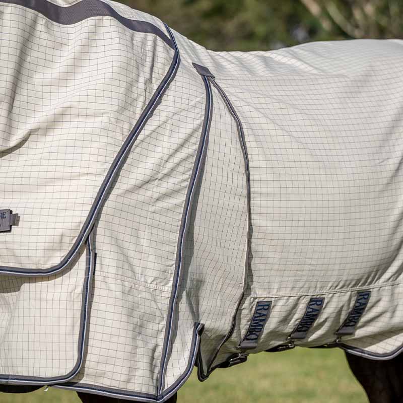 Passformen säkras med tre raka gjordar och dubbla benbågar, medan ett extra långt svansskydd ger mer täckning baktill. Täcket är tillsist utrustat med en avtorkningsbar PVC-svansrem, samt öglor för bensnören.