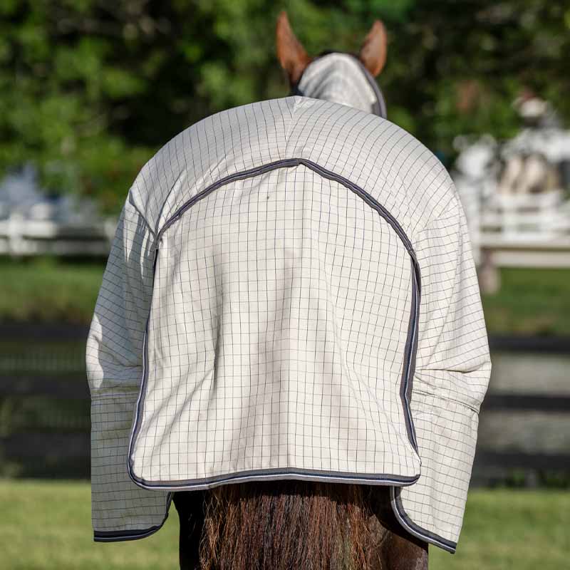 För att minska friktion mot pälsen är täcket fodrat över bog, man och svansskydd. Framtill stängs det med en bib-frontstängning som ger en stabil och bekväm passform. Täcket levereras även med en avtagbar halsdel.
