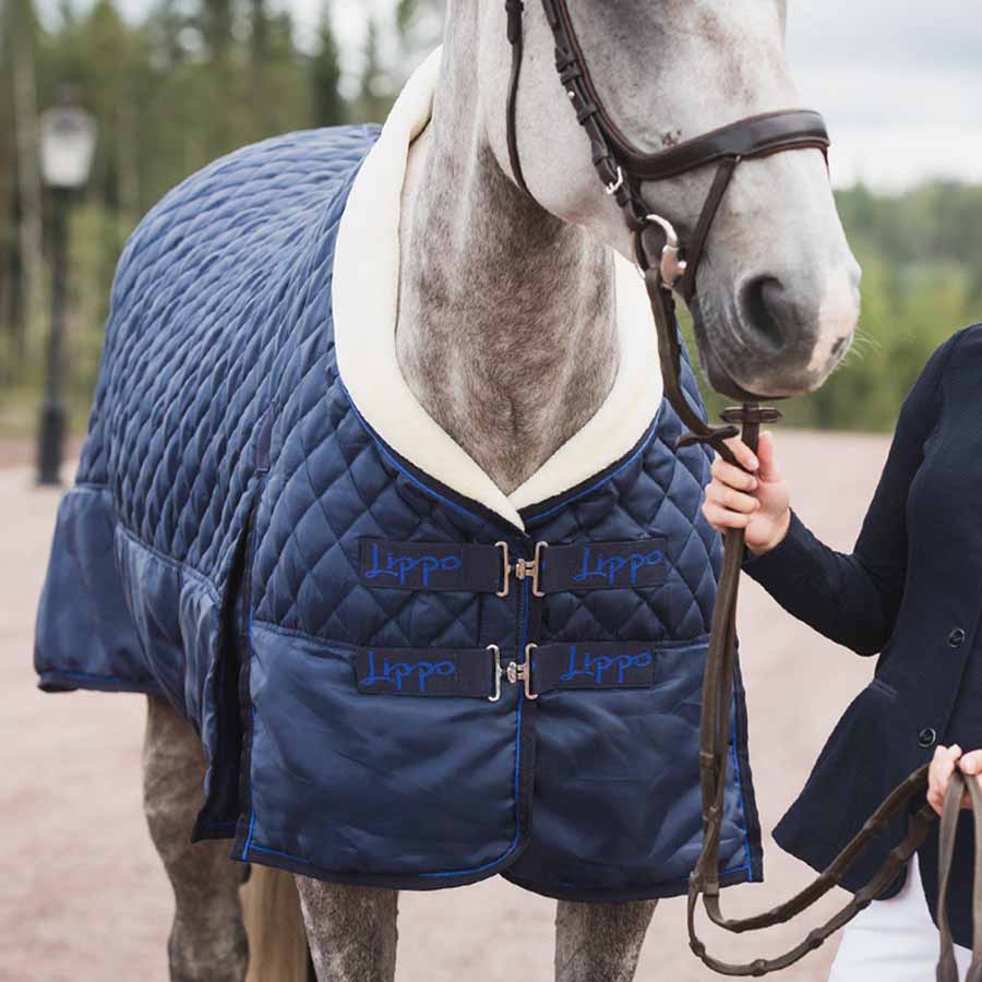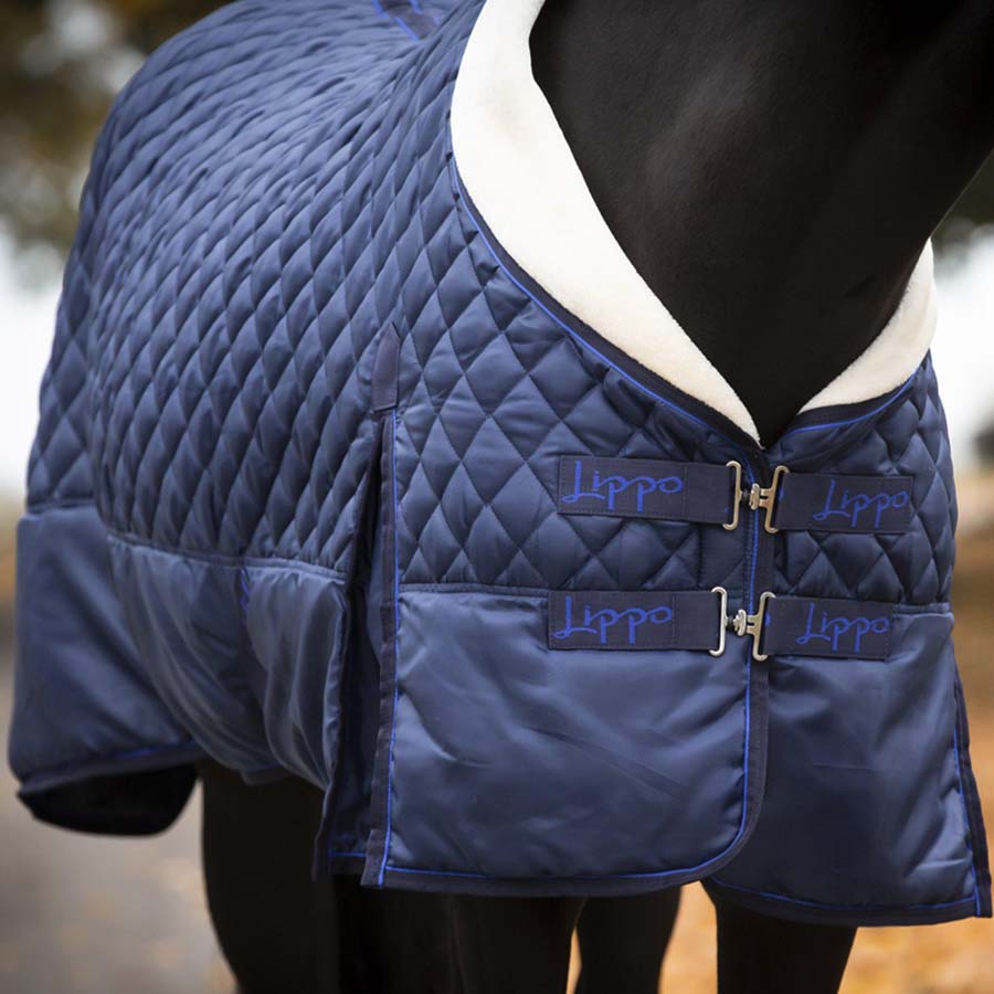 Lippo Tävlingstäcke Show 200g i marinblå är ett utmärkt val för att hålla din häst bekväm och skyddad under tävlingar. Täcket har ett yttertyg i 420D polyester och är quiltat med 200 gram vadd för extra värme. Den dubbla kragen i mink fleece syntetpäls ger en mjuk och skön känsla mot hästens hals. Innerfodret i mjuk coral fleece bidrar till ytterligare komfort.