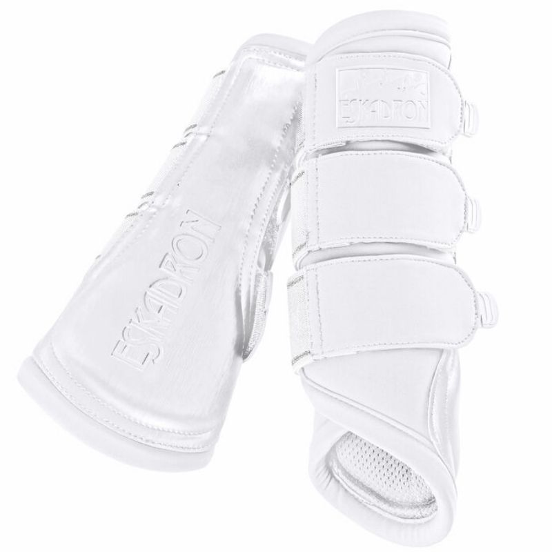 Ett par Eskadron damasker i vit softshell som kombinerar stil och funktion. Dessa skydd har en robust skyddszon med PU-inlägg och är designade för att ge stötdämpande och tryckfördelande effekter. Insidan är utrustad med mesh som har hög luftgenomströmning, vilket bidrar till komfort och ventilation. Elastiska kardborrband säkerställer en säker och justerbar passform.