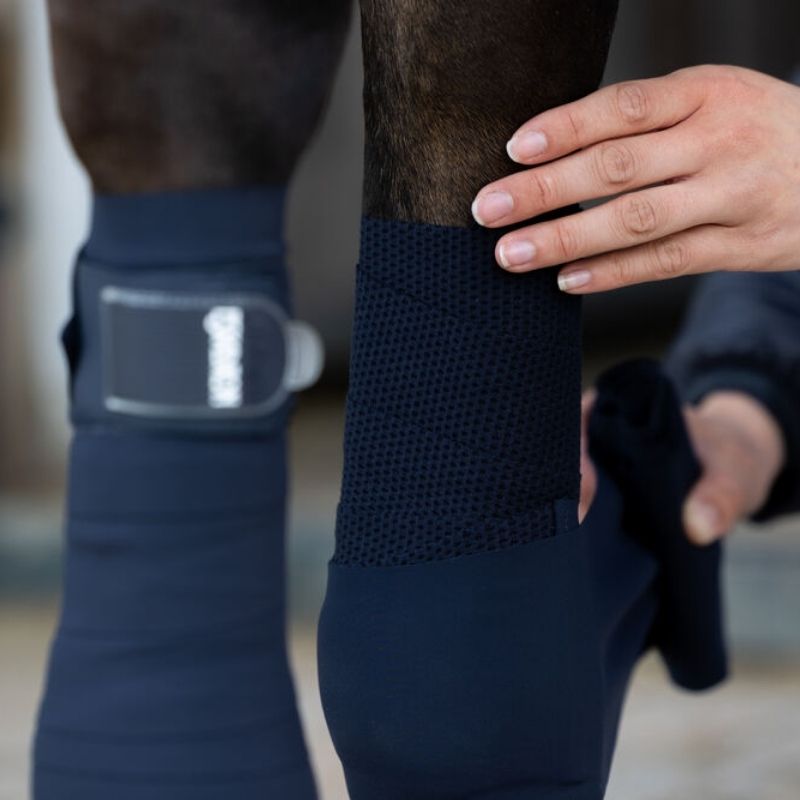 Eskadrons benlindor i modellen Softshell Mesh kombinerar softshell och mesh för hög andbarhet. Dessa marinblå benlindor kommer i ett set om fyra och levereras i en praktisk väska med dragkedja. Varje bandage mäter 250 cm x 10,5 cm, vilket ger en bra passform och täckning.