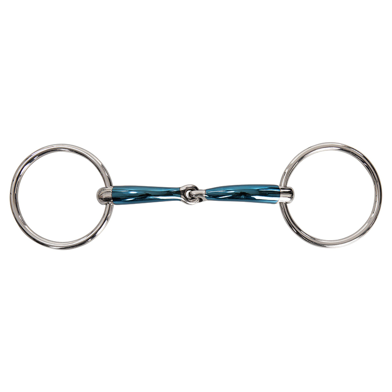 Ett högkvalitativt tvådelat tränsbett, från Lippo, med lösa ringar och Lock Up-funktion. Tillverkat i rostfritt stål och belagt med blå Sweet Iron, vilket stimulerar hästens tuggreflex och ökar salivflödet.