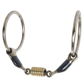 Ett anatomiskt tredelat tränsbett, från Lippo, med mässingsrullar och lösa ringar. Tillverkat i rostfritt stål och belagt med blå Sweet Iron, vilket, tillsammans med rullens uppmuntrande av ökad tungaktivitet, stimulerar hästens tuggreflex och ökar salivflödet.