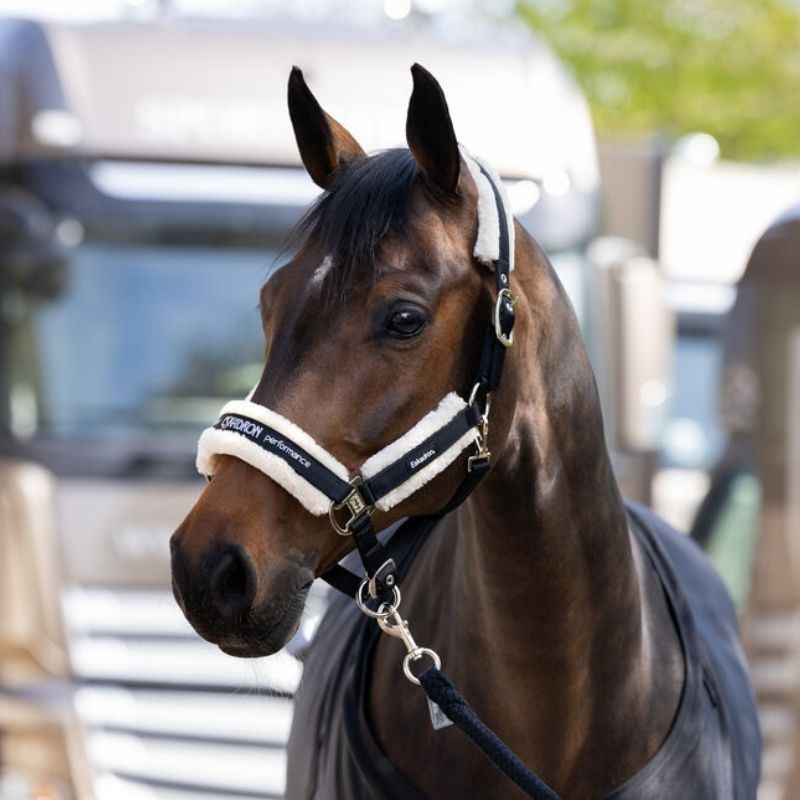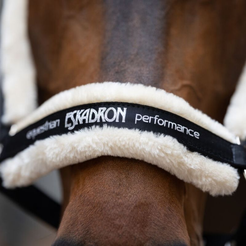 Eskadron Grimma Fauxfur Double Pin i svart är en högkvalitativ grimma med ett glansigt yttertyg och slitstarkt vävband på insidan. Den har dubbla piggspännen för symmetrisk justering och är även justerbar under hakan. Grimman är utrustad med lättskötta och löstagbara FauxFur-foder i nos-, nack- och sidostycken, vilket ger extra komfort för hästen.