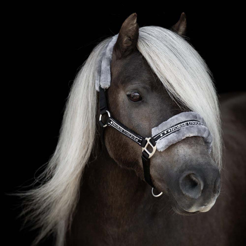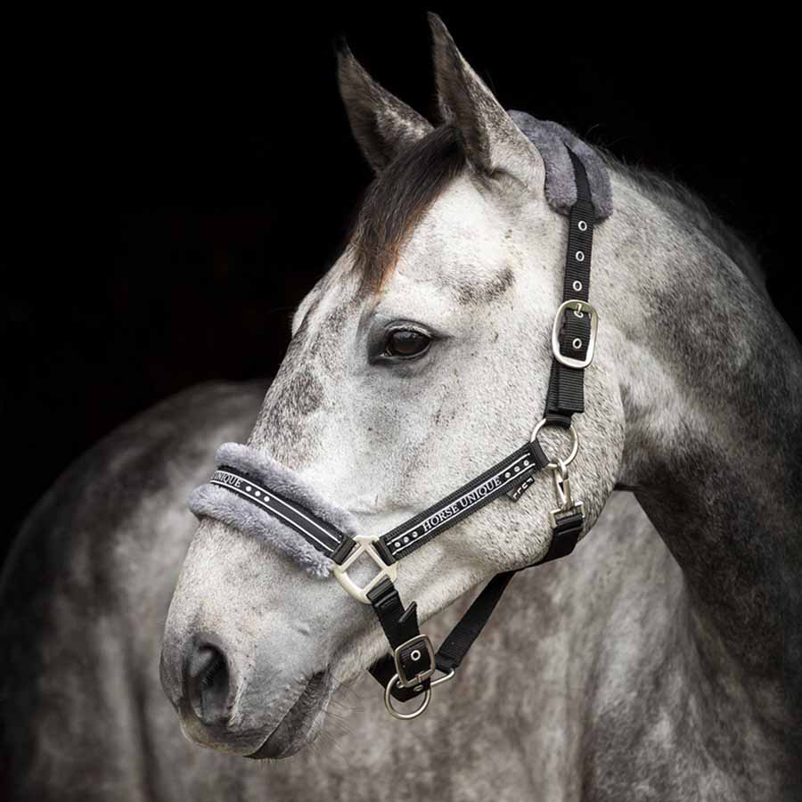 En bekväm grimma i skön polypropylene, och mjukt ludd som täcker både nos och nacke på hästen. Nos- och nackremmarna är ställbara för att hitta bästa passform. Spänne och detaljer är i en snygg matt silver. Både sidostycke och nos är även försedd med Horse Unique broderi och dekorstenar. Artikelnummer: