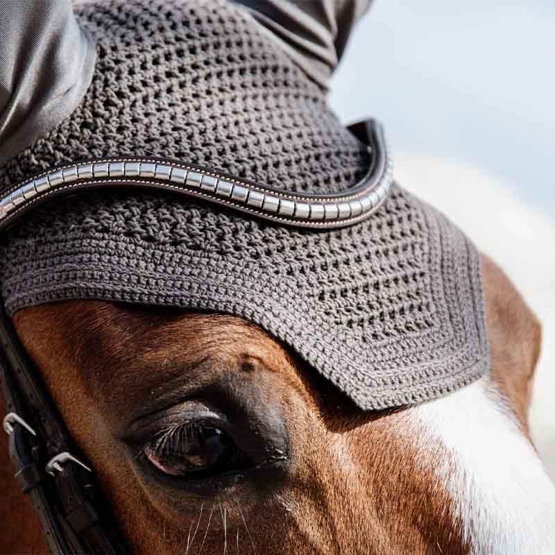 Kentuckys flughuva Wellington, här i grått, är ett resultat av kombinationen av det mycket populära "amerikanska" utseendet och Kentucky Horsewears expertkunnande. Denna flughuva är handstickad med hög hållbarhet och ett snyggt utseende, därutöver skyddas även hästens öron mot irriterande flugor och andra insekter under ridning.