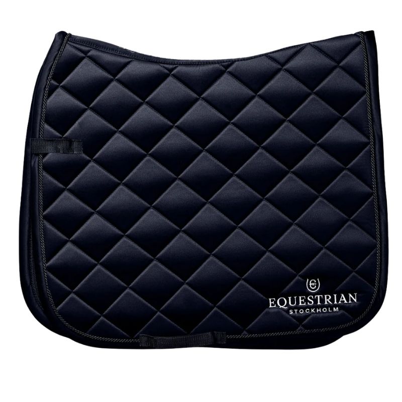 Dressyrschabraket från Equestrian Stockholm, modell ES Line, i färgen Midnight Blue, är designat för att hålla din häst sval och torr under träning. Insidan är behandlad med High IQ Cool Comfort, vilket effektivt transporterar bort fukt och torkar snabbt. Schabraket har kantband, passpoal och vit brodyr för en elegant look. Kardborreband och en gjordrem ser till att schabraket sitter säkert på plats. Tillverkat i hållbar polyester, är det perfekt för regelbunden användning.