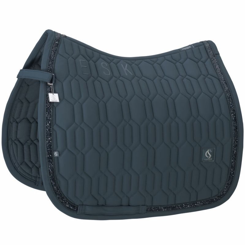 Eskadron Dressyrschabrak Softshell Jewel Classic Sports i en elegant grön färg kombinerar stil och funktionalitet. Utsidan är tillverkad av robust softshell, medan insidan har en cool-dry funktion för optimal komfort. Den kompakta quiltningen ger en snygg design, och den anti-slip ytan i silikon under sadeln säkerställer att schabraket ligger stadigt på plats. En elegant kombination av passpoaler och stenar med kantband i softshell ger en exklusiv look.