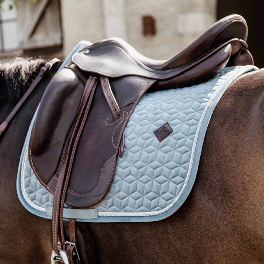 Dressyrschabrak Velvet är både stiligt och klassiskt, med en dubbel snodd som ger en elegant finish. Det har en stjärnquiltning som inte bara ser bra ut utan också ger bra dämpning mellan hästens rygg och sadeln, vilket skyddar mot friktion. Den är designad för dressyr och har ingen irriterande rem för att fästa vid sadeln, utan endast en nylonrem för sadelgjorden. Det subtila konstläderlogotypen är placerad centralt och något högre, vilket alltid lämnar plats för att brodera ditt eget märke om så önskas.