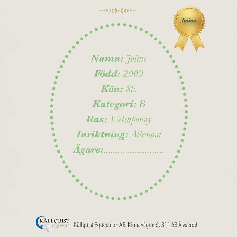 Joline är en välgjord käpphäst baserad på rasen welshponny. Käpphästen är tillverkad i polyester, med man och pannlugg i garn som går alldeles utmärkt att fläta. Pinnen är gjord i asp, ett lätt träslag som ger bra balans vid användning.