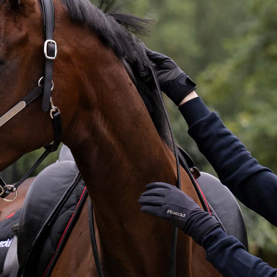 Winsford vinterridhandskar är perfekta för kalla och regniga dagar i stallet eller på hästryggen. Dessa svarta unisexhandskar har en slimmad ComfortCut och elastiskt VaporFlex-laminat för en perfekt passform som följer handens rörelser utan att bli spänd. Handryggen är gjord av Duradeo, ett robust och vattentätt syntetiskt mockamaterial som ger ett halkfritt grepp för precis tygelhantering. ROECKL-Tec Membran håller händerna torra i svåra väderförhållanden, medan det mjuka Easy-Dry innerfodret ger extra värme och komfort. Pekskärmskompatibla tummar och pekfingrar gör att du kan använda din smartphone utan att ta av handskarna.