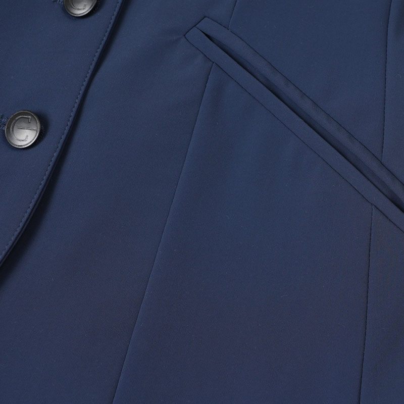 Covallieros marinblå tävlingskavaj för barn och junior kombinerar en snygg, stilren design och material med funktionella egenskaper. Den har en smidig passform som, tillsammans med det elastiska materialet, säkerställer optimal rörelsefrihet i sadeln. Materialet har även en mycket god andningsförmåga som bidrar till att hålla dig sval och bekväm även under mer intensiva tävlingsdagar.