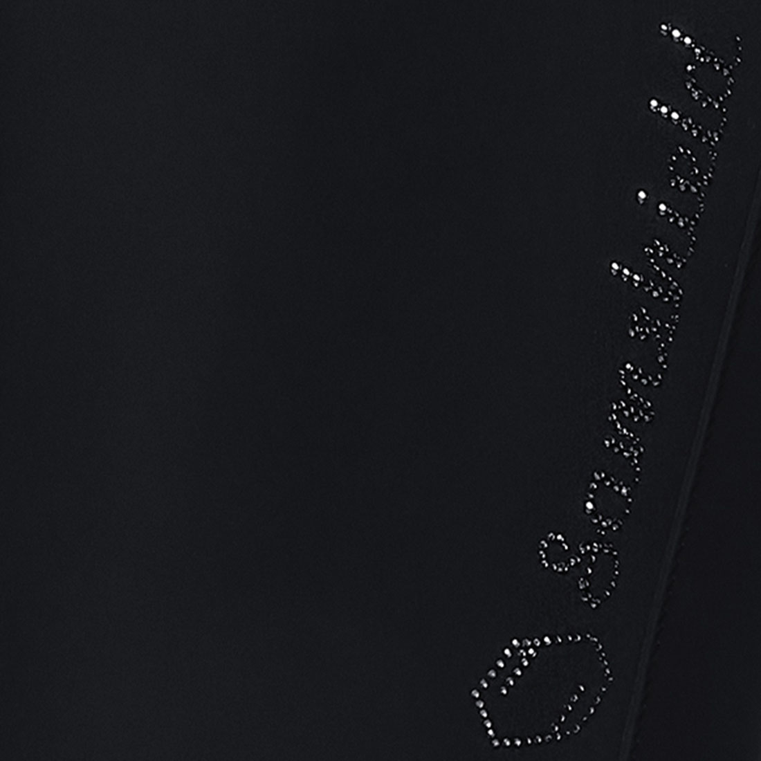 Ridbyxorna har detaljer i Swarovski-kristalltyg vid bälteshällor och bakfickor, samt veck baktill. En Swarovski-logotyp är placerad på låret.