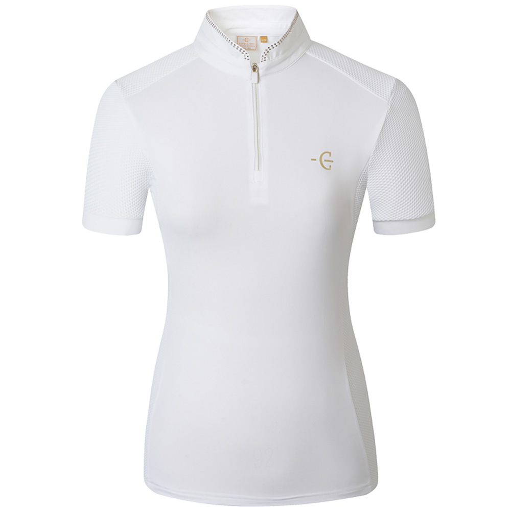 Covallieros tävlingstopp kombinerar sportig prestanda med stilren design. Det andningsbara och elastiska materialet säkerställer optimal komfort och maximal rörelsefrihet i sadeln. Den eleganta höga kragen med diskret glitterdetalj ger en elegant touch.