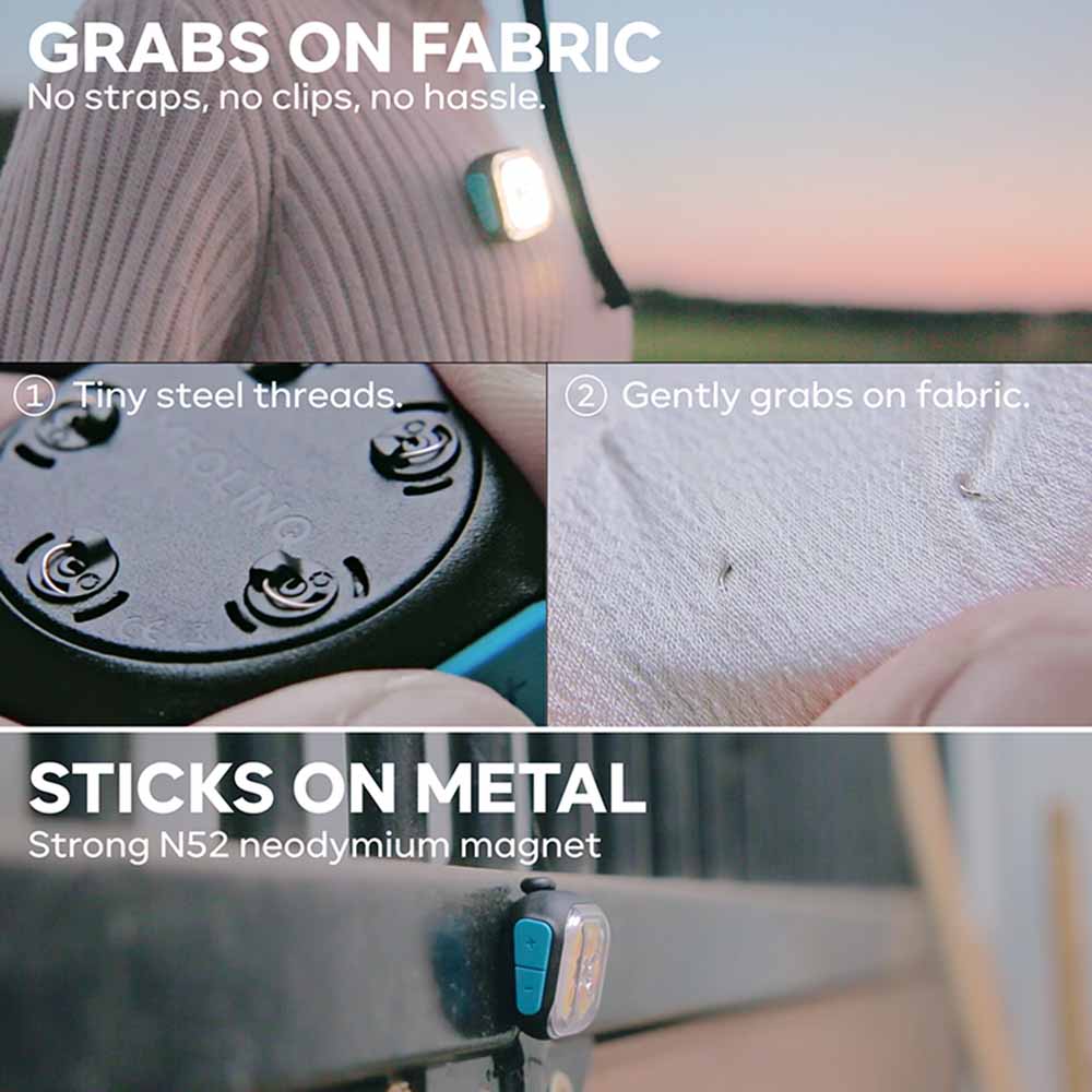 - Fästs direkt på kläder eller utrustning utan att skada materialet