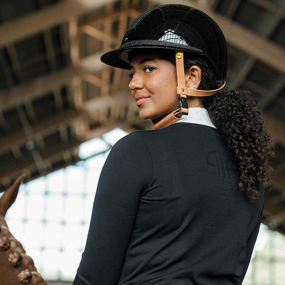 Hansbo Sports MIPS Vision Shiny Star är en elegant och säker hjälm för ryttare. Den har en blank, glansig finish med en bred solskärm och gnistrande paneler. Hjälmen är utrustad med MIPS-systemet för extra skydd och har sex ventilationsöppningar för optimal luftcirkulation. Det justerbara hakbandet i brunt konstläder ger en bekväm passform, och innerfodret av Cooldry-material håller huvudet svalt och torrt.