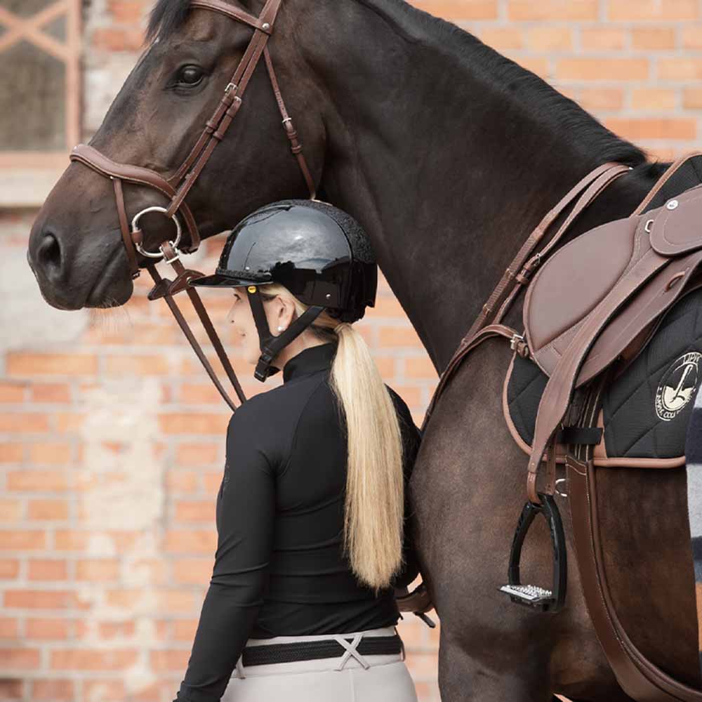 Skärmen är tillverkad av PA-Polyamid TECAMID och hjälper till att skydda ansiktet mot sol och regn. Med en vikt på 590g (+-30g) är hjälmen lätt att bära under längre ridpass. Den avtagbara liner i cool-dry mesh håller dig sval och bekväm, och hakremmen i eco-läder med 4-punktspänne säkerställer en säker passform.