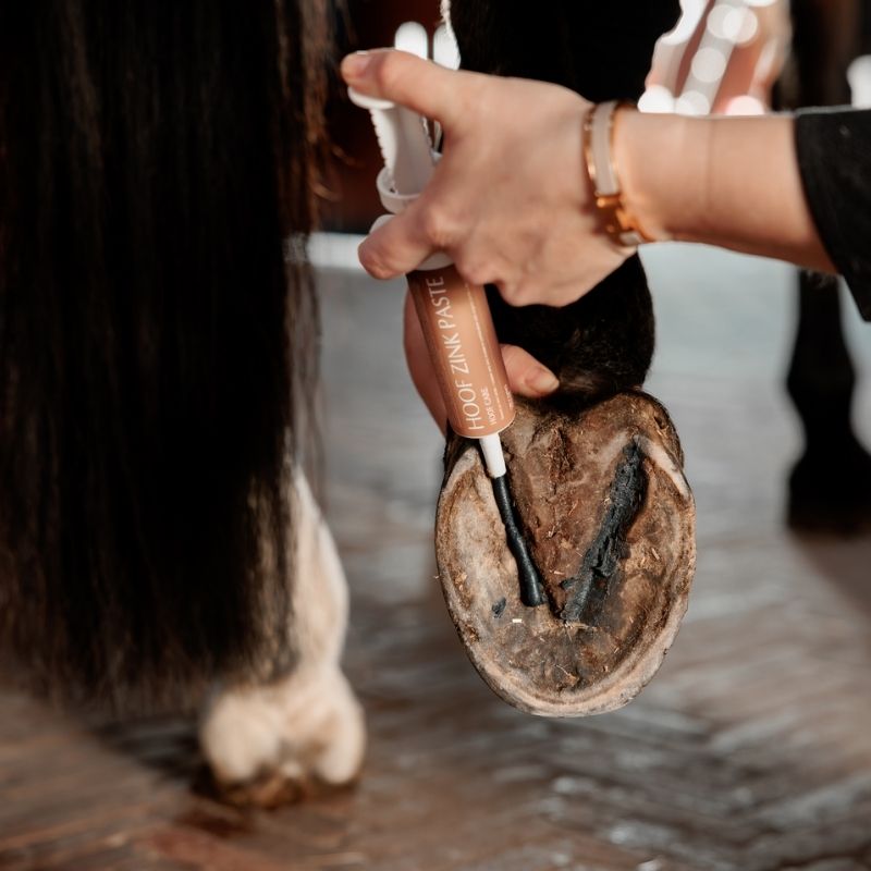 Applicera en liten mängd pasta direkt på strålen och andra områden som behöver extra vård. Tryck försiktigt så att pastan fäster ordentligt och får god kontakt med hoven. Upprepa vid behov för att bibehålla skydd och stärka hovens struktur över tid.