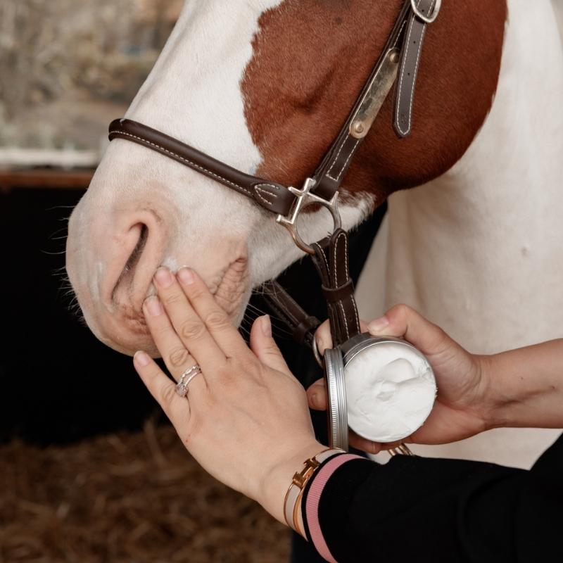 Applicera ett generöst lager Sunblock på utsatta områden såsom hästens mule, karleder och annan exponerad hud innan solexponering. Återapplicera vid behov, särskilt om produkten tvättas bort, även om den vattenresistenta formulan ger ett långvarigt skydd.